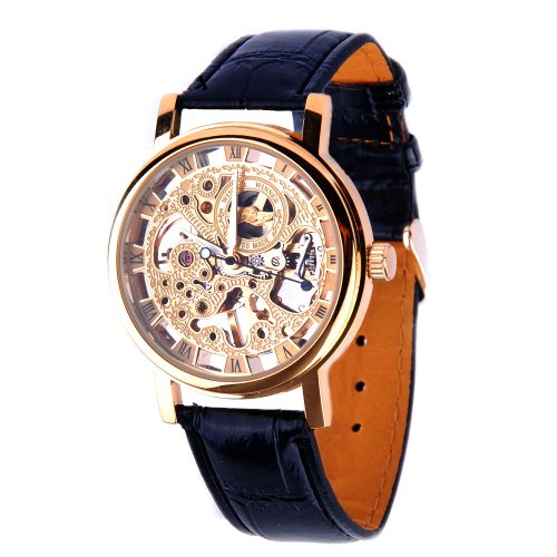 Mens Mechanical Skeleton Watch Hand Wind Up Gold Dial Black Leather Strap MW-06 Review