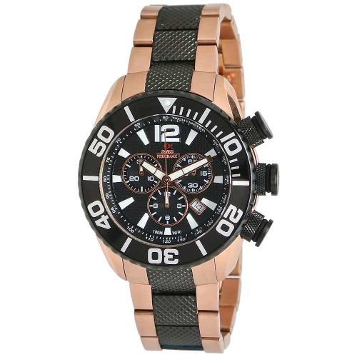 A change of pace is always refreshing, and this Swiss Precimax watch is just what the doctor ordered. This watch sports an unmistakably stylish, two-tone, rose gold and black case and band, which is bound by a secure fold over clasp with double push button safety. The stainless steel screw-down crown protects the inner mechanics of the watch, providing this timepiece with a reliable 100 meter water resistance. A true focal point, the three black sub dials are powered by a precise chronograph movement, made from Swiss parts, which provides this the true timekeeping accuracy necessary for a variety of activities. Additional features include a scratch-resistant Sapphimax crystal, tachymeter, and date function.
